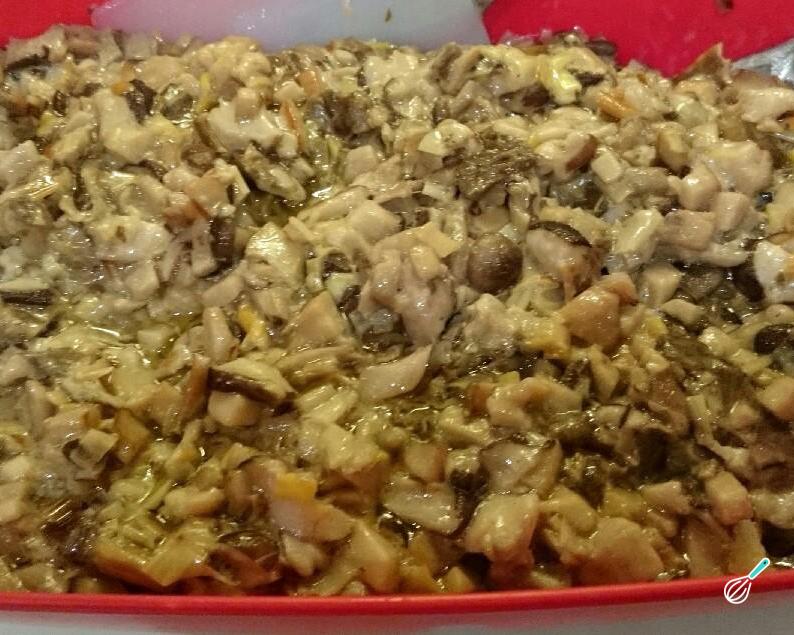 À parte prepare o recheio: pique o alho poró e os cogumelos e refogue numa frigideira com 1 colher de sopa de manteiga e 1 colher de sopa de azeite por 5-10 minutos. Coloque o vinho e deixe ferver por 1-2 minutos, para evaporar o álcool. Junte o creme de leite, tempere a gosto com sal e pimenta, misture tudo e desligue o fogo.