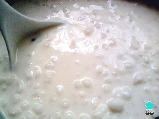 Depois de cozer os grãos na pressão, coloque-os noutra panela. Bata o leite em pó, o leite desnatado e o adoçante no liquidificador até obter uma mistura homogênea e coloque-a na panela dos grãos previamente cozidos.