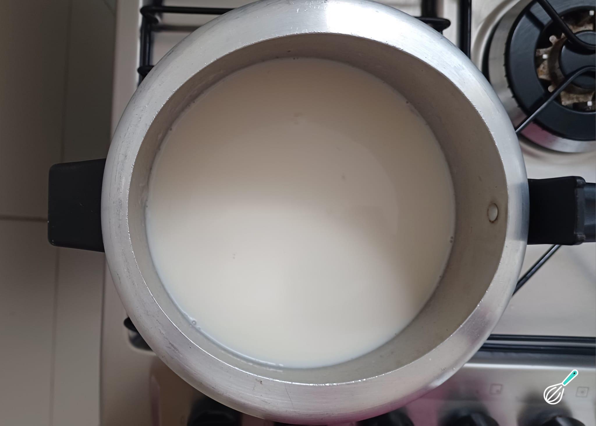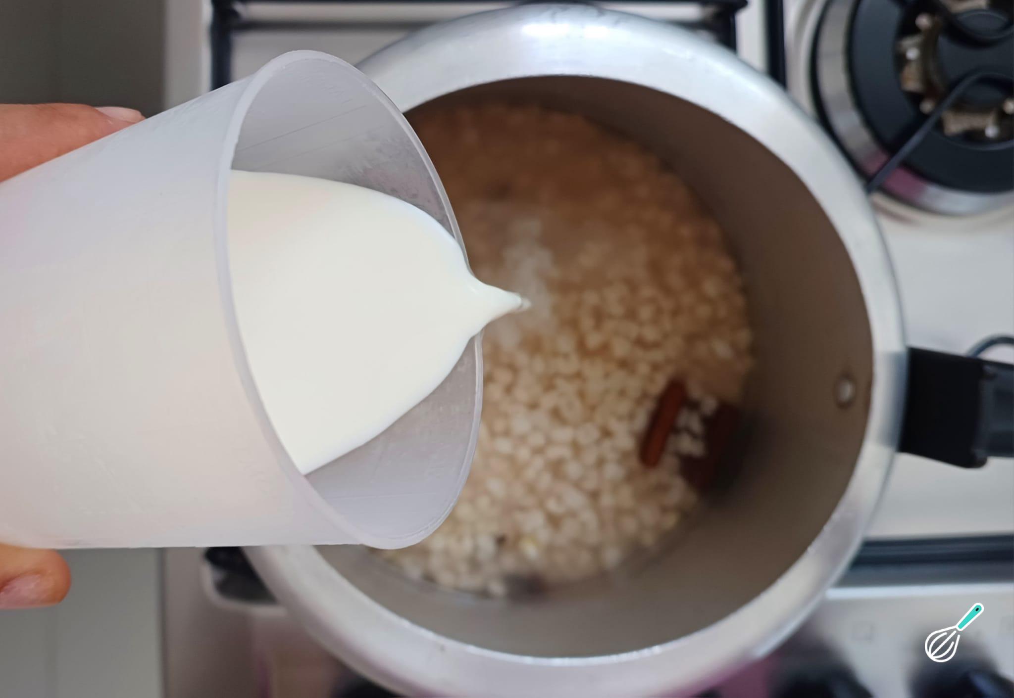 Após sair toda a pressão, abra a panela e verifique se o milho branco já está cozido, adicione o leite e misture.