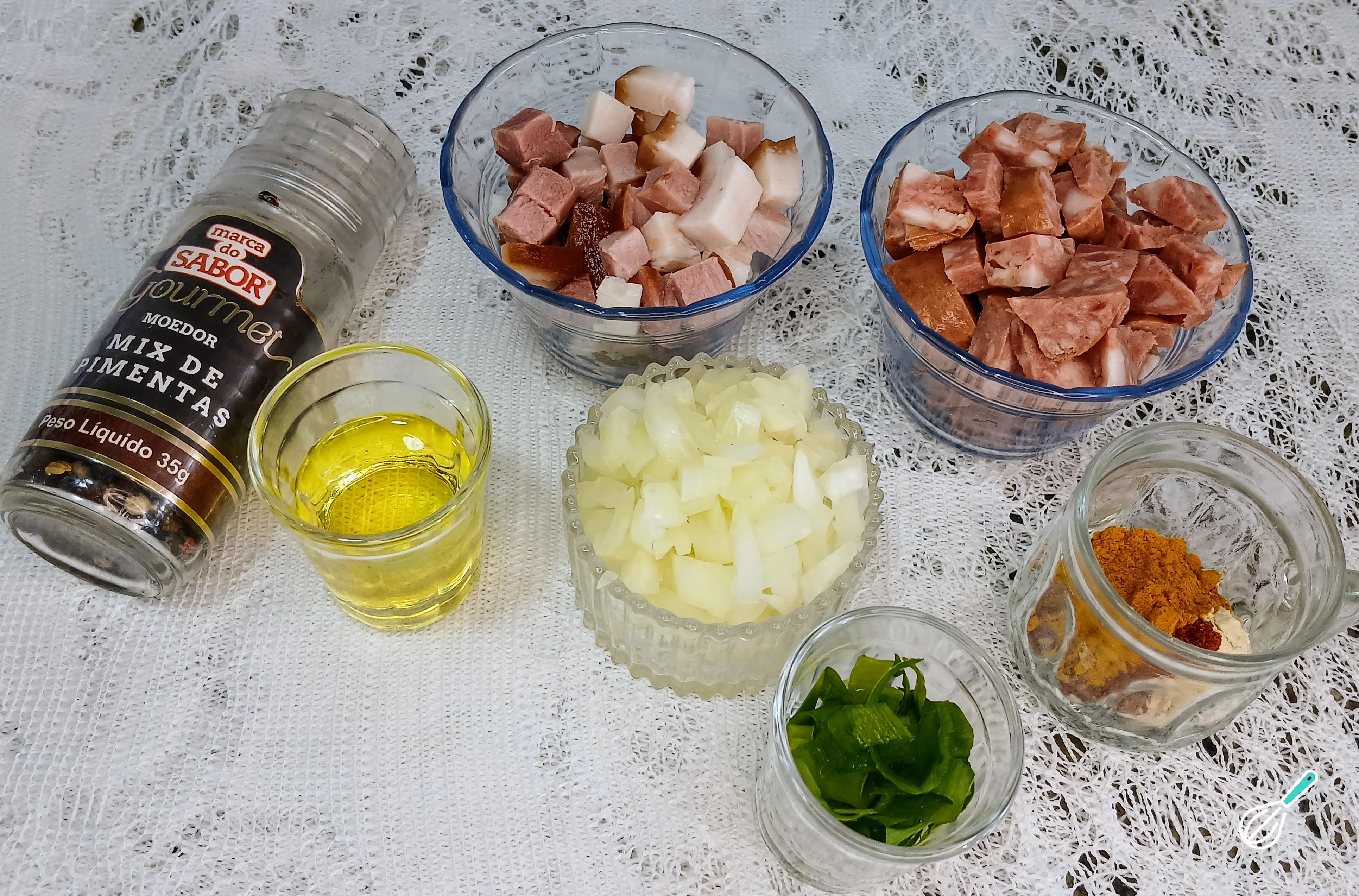 Depois da canjica pronta, separe os outros ingredientes para o preparo. Corte a calabresa e o bacon em cubos pequenos. Corte a cebola branca em cubos e a cebolinha e salsinha e rodelinhas finas e pequenas. Separe os temperos de sua preferência, o sal e a pimenta, e o óleo.