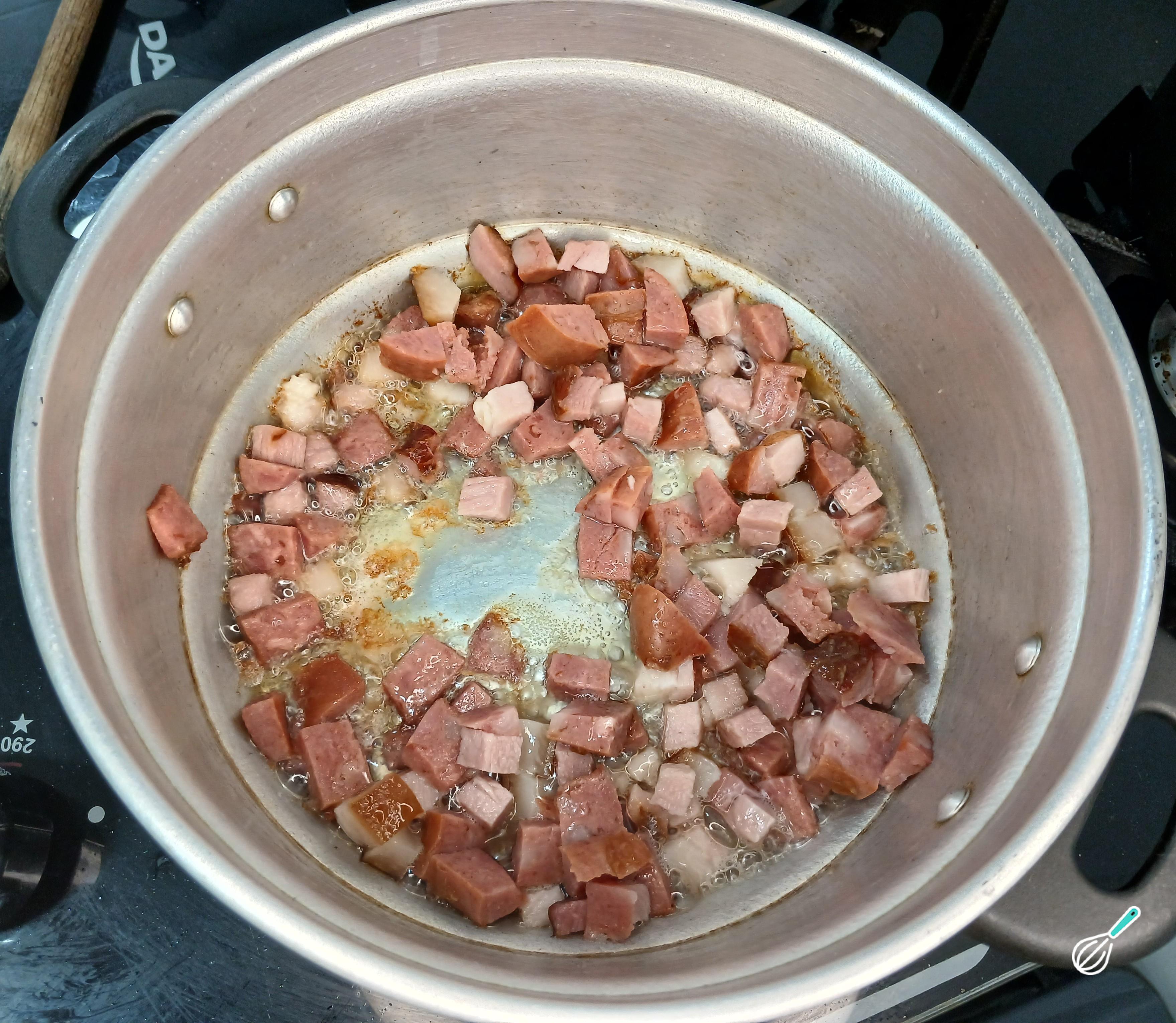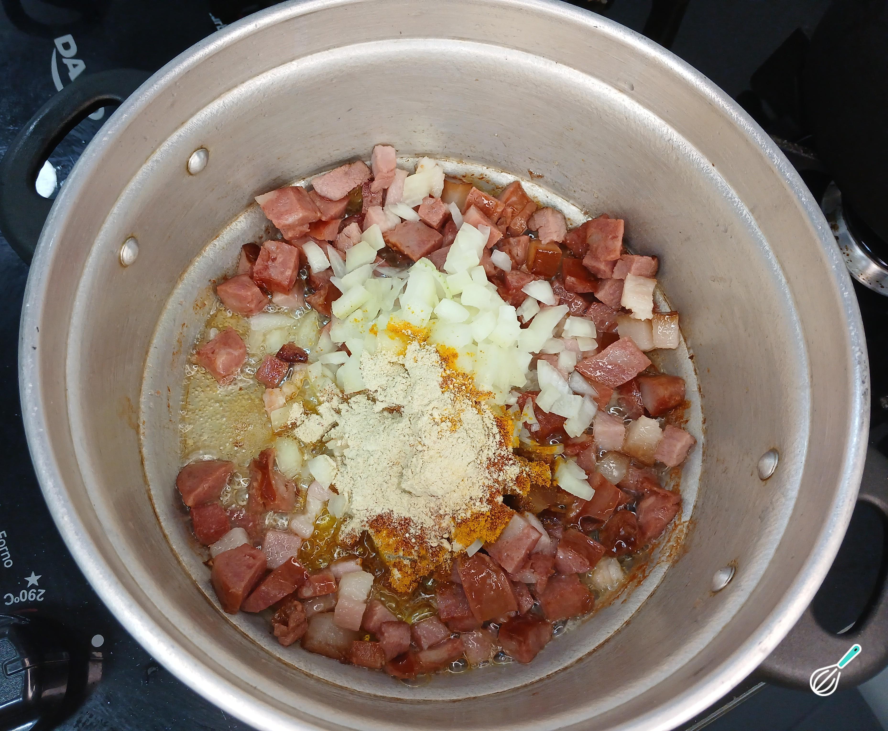 Em uma panela média, coloque o óleo de soja, o bacon e a calabresa para fritar. Deixe que frite bem para unificar os sabores.
