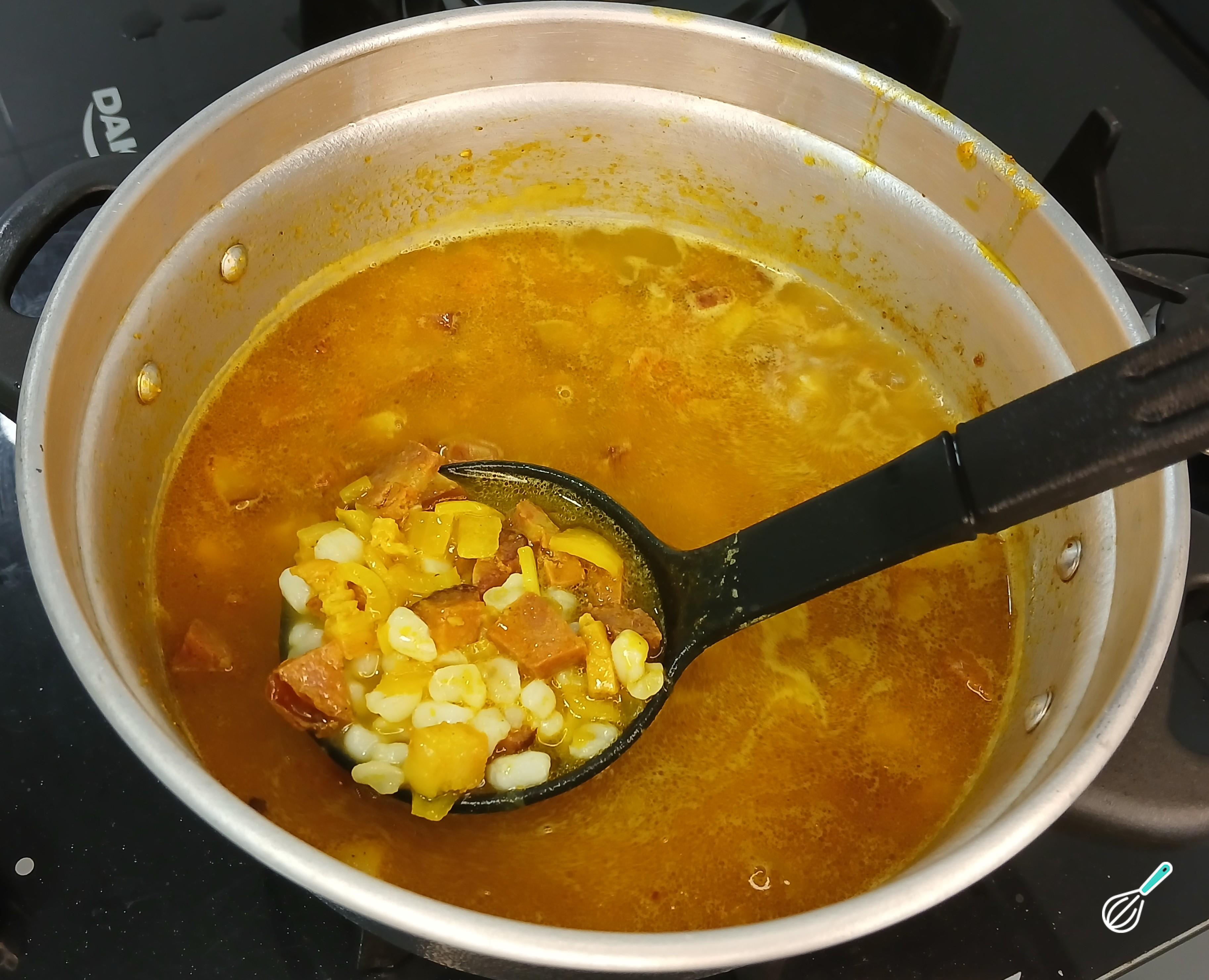 Depois de fritar o bacon, a calabresa e a cebola, acrescente a canjica já cozida e coloque o caldo para engrossar e encorpar. Deixe cozinhar um pouco. Mantenha o fogo baixo.