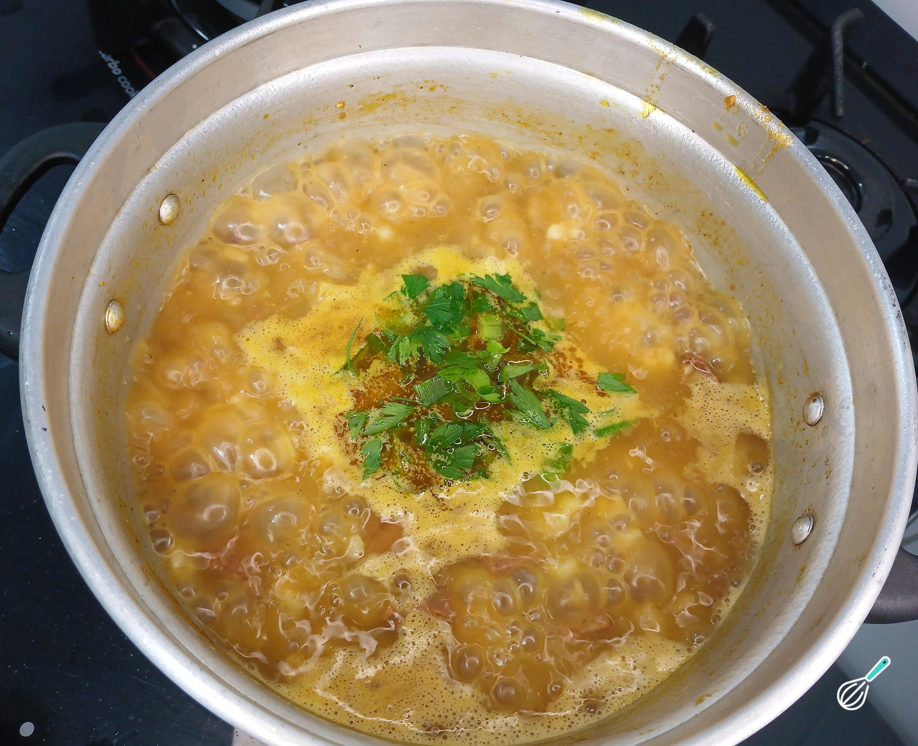 Depois de cozinhar um pouco, acrescente a cebolinha verde e salsinha. Mexa e prove. Se necessário, acerte sal e pimenta.