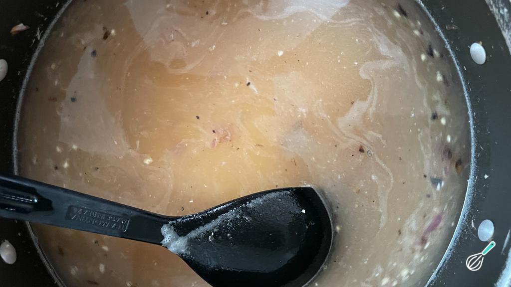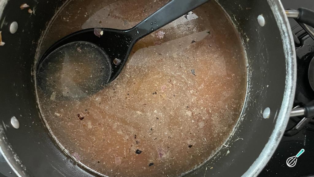 Adicione o caldo na panela com o refogado e raspe o fundo para soltar os pedaços que podem ter ficado grudados.