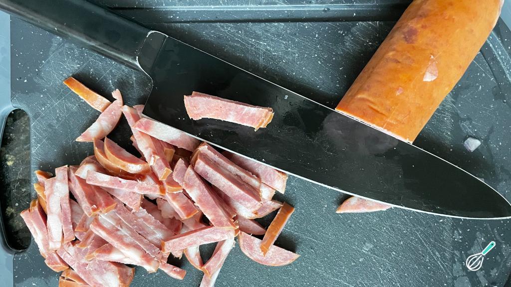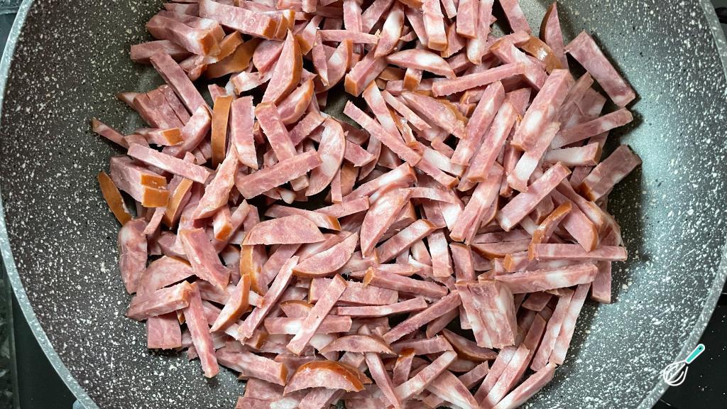 Enquanto a canjiquinha cozinha, corte a linguiça calabresa em tiras.