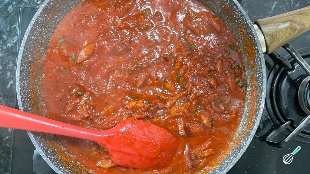 Adicione o molho de tomate, o extrato de tomate, a páprica picante, a pimenta do reino, a 1 colher de chá de sal, o orégano e a cebolinha misture bem e cozinhe por 10 minutos.