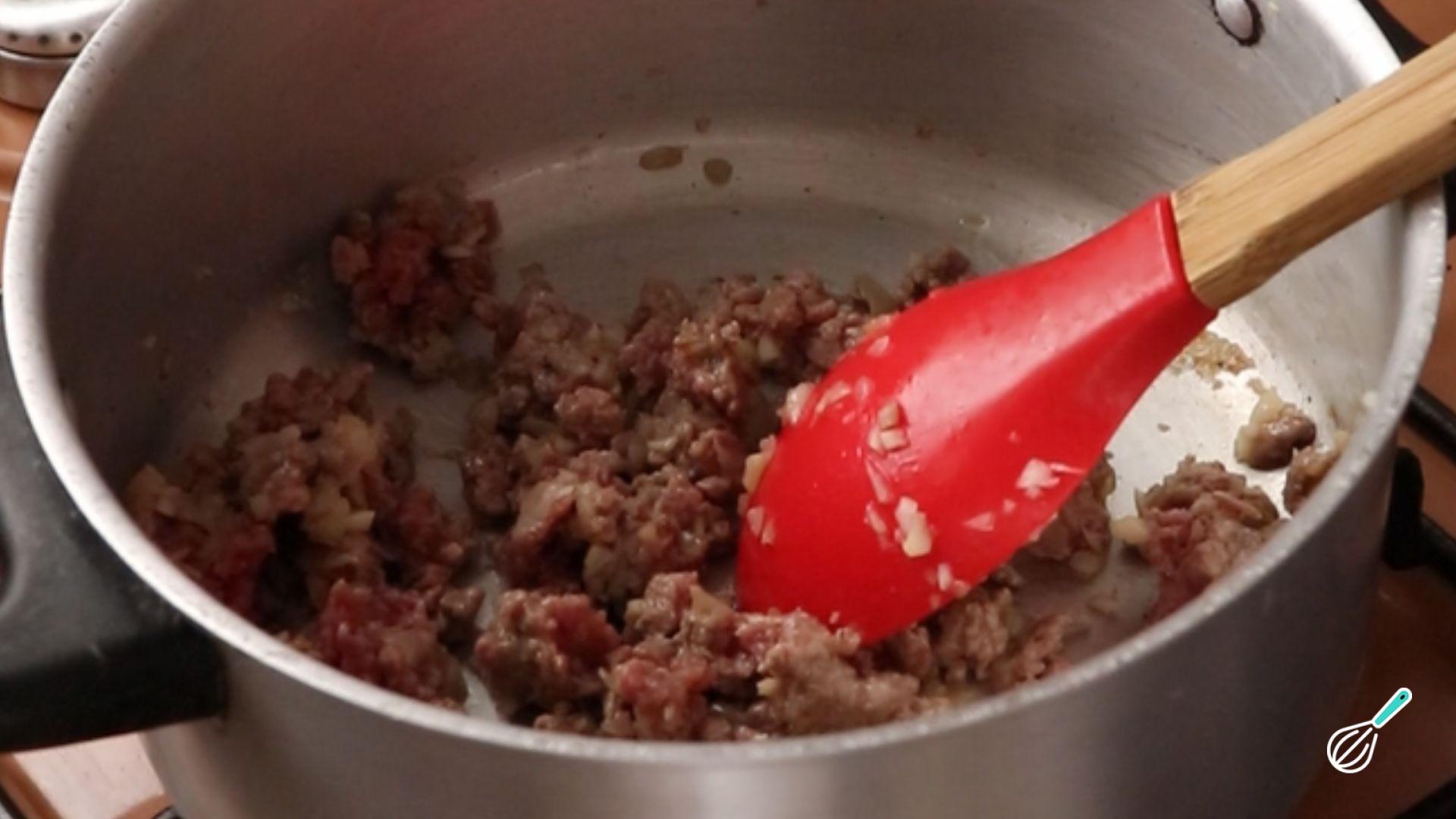 Acrescente a carne moída, tempere com sal e pimenta a gosto e refogue bem até ficar bem douradinha.