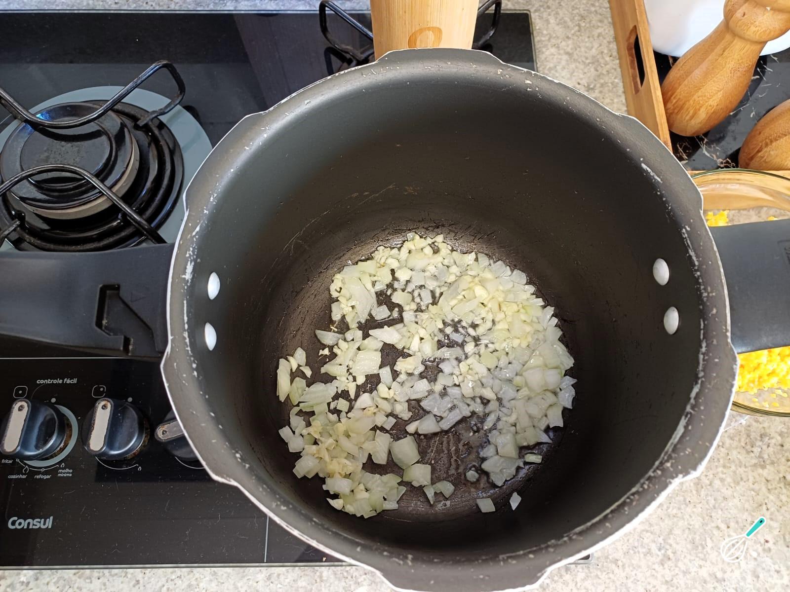 Em uma panela de pressão, aqueça o azeite e refogue o alho e a cebola até ficarem transparentes.