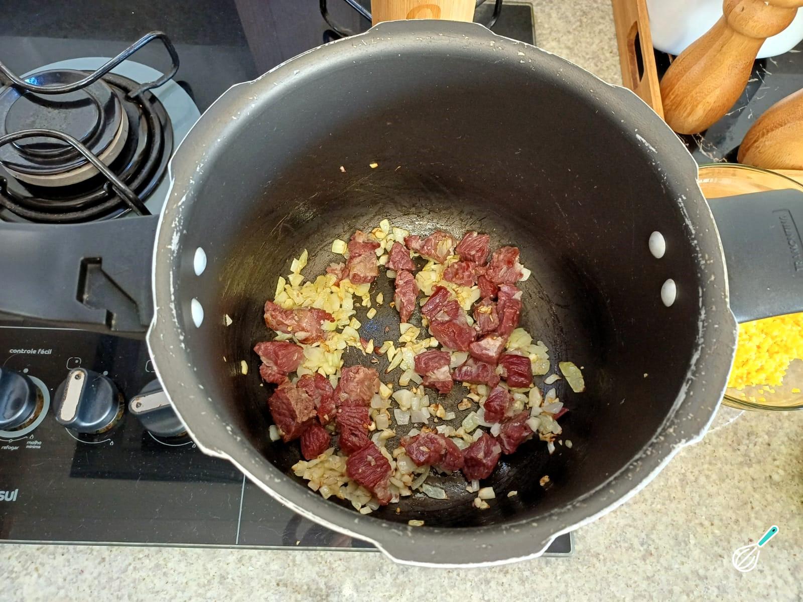 Prepare a carne seca. Corte em cubos e deixe de molho de um dia para o outro, para dessalgar. Descarte a água e coloque na penela de pressão coberta com água e cozinhe por 15 minutos após pegar a pressão. Descarte novamente a água e reserve.