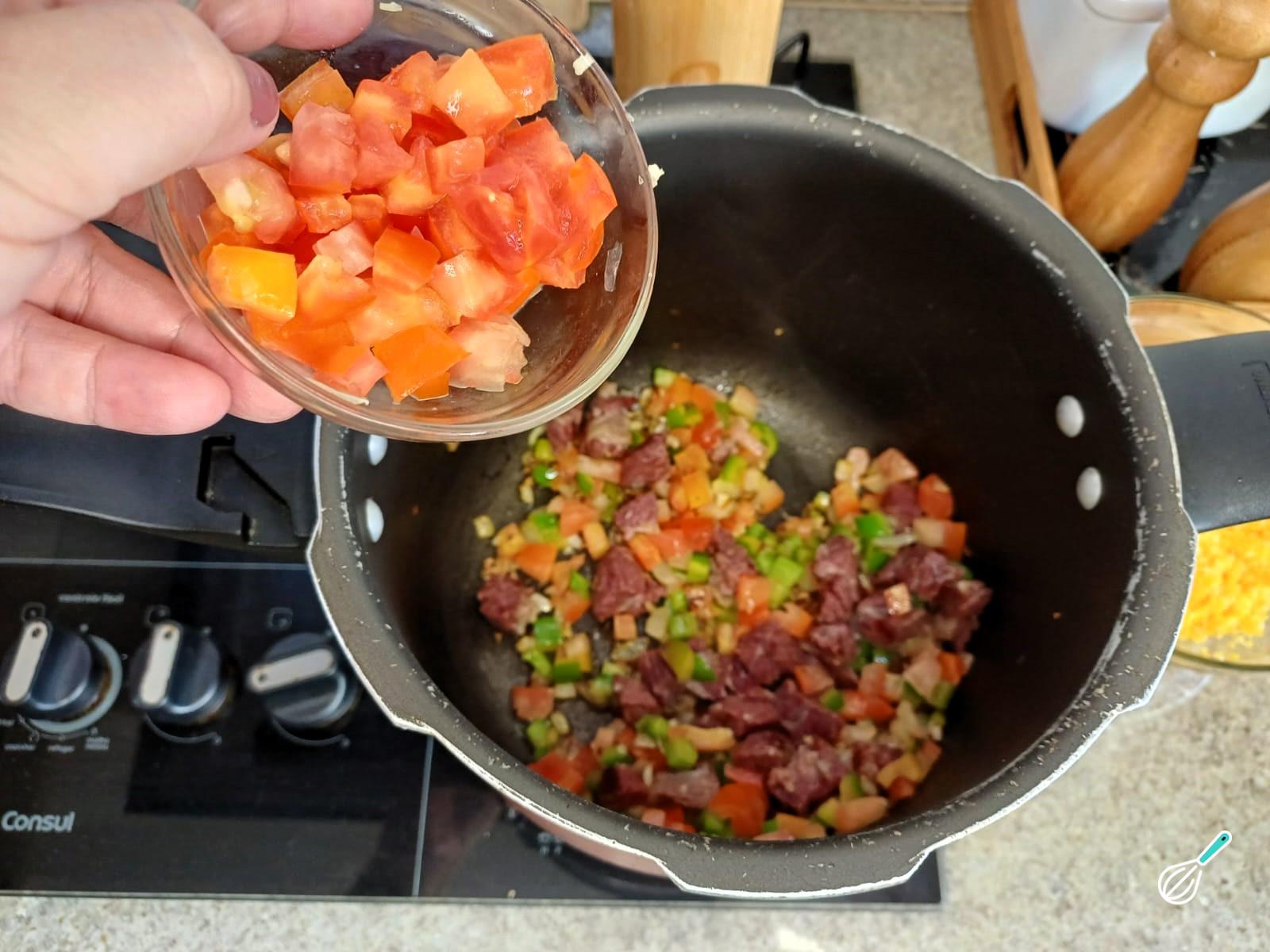 Acrescente o pimentão, os tomates, tempere com sal, pimenta-do-reino e a páprica defumada.