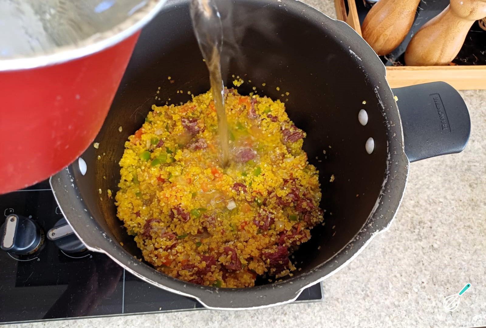 Junte a canjiquinha demolhada, mexa bem e cubra os ingredientes com a água.