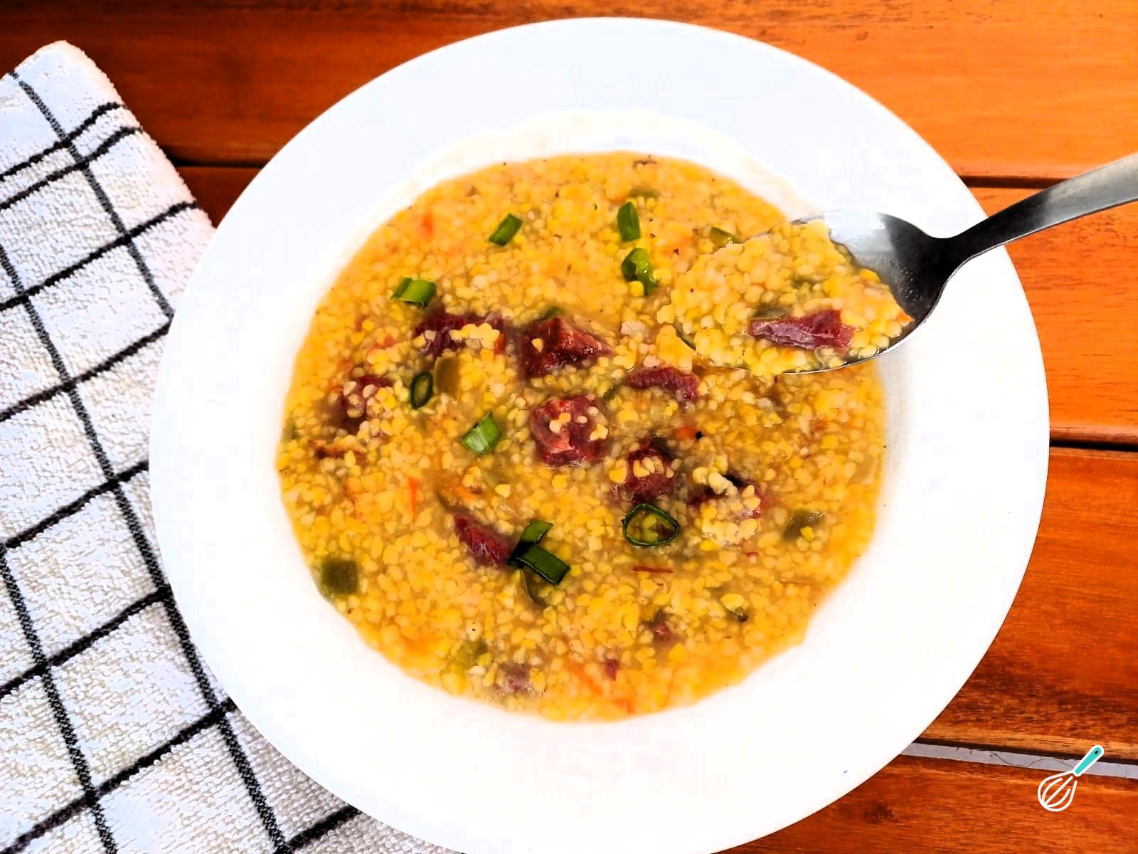 Dica: A canjiquinha fica com um caldo cremoso e saboroso e à medida que for esfriando ficará mais espesso.