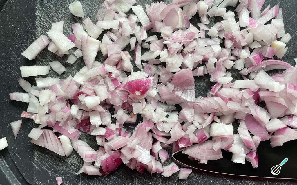Descasque e pique a cebola roxa.