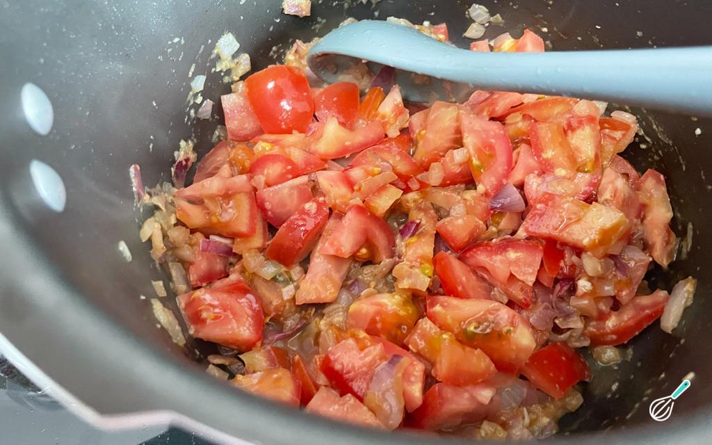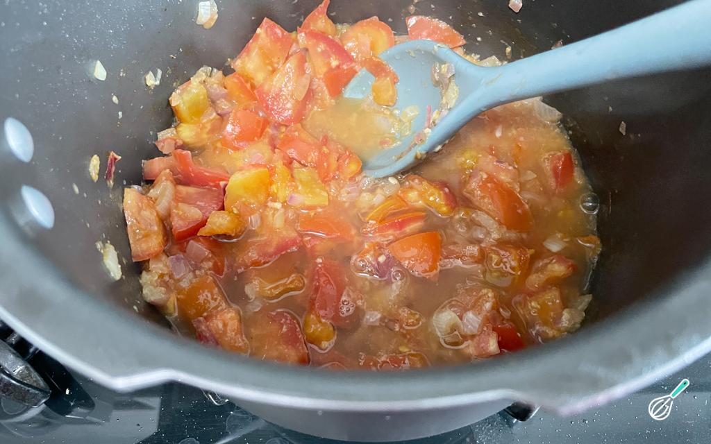 Adicione os tomates e deixe cozinhar por 5 minutos. Tempere com o suco de limão, o sal, a pimenta do reino e a páprica picante.