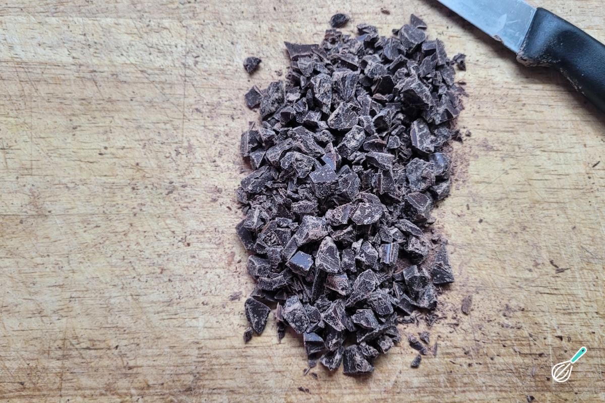 Enquanto isso, pique bem o chocolate. É importante picar bem o chocolate - assim como pistache, nozes, etc, que estiver usando para que não entupa o saco de confeiteiro.