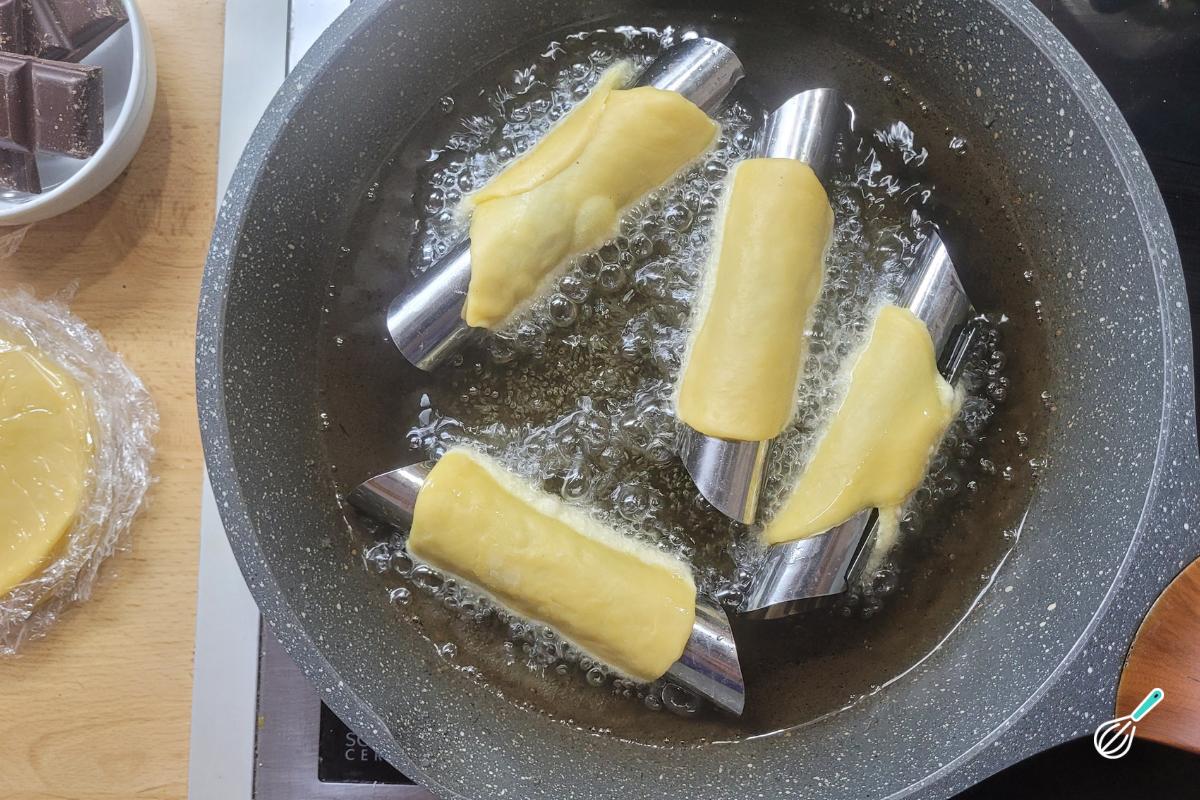 Se ainda tiver mais massa, repita o processo de modelagem com os mesmos tubos e leve a massa para fritar até acabar.