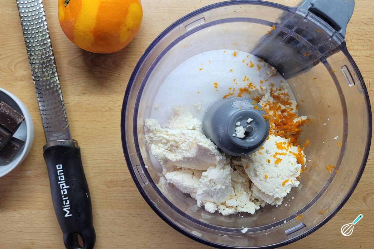Para fazer o recheio, verifique se a ricota está bem sequinha. Leve a ricota com o açúcar e as raspas de laranja para um processador e bata muito bem até ter um creme bem lisinho e cremoso. Se necessário, vá raspando as laterais.