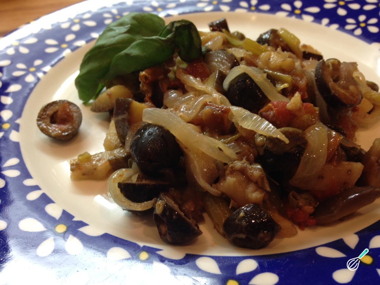 Cozinhe por mais alguns minutos para que os aromas se soltem. Deixe esfriar a caponata de berinjela até à temperatura ambiente e está pronto para servir, acrescentando folhas de manjericão no prato.