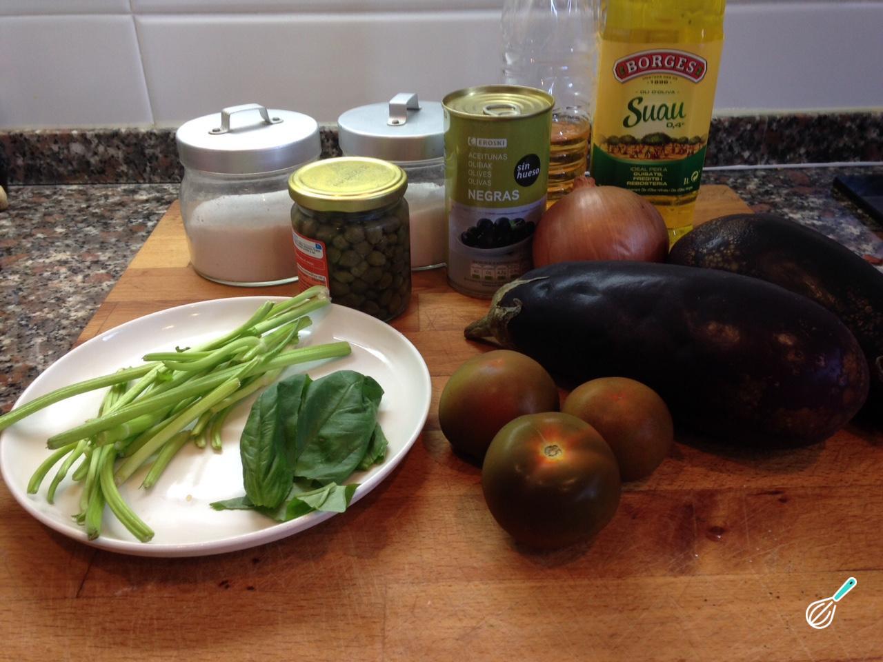 Prepare os ingredientes para fazer a caponata de berinjela. A maioria dos ingredientes são do mercado. As azeitonas podem ser pretas e verdes e é importante que não tenham caroço.
