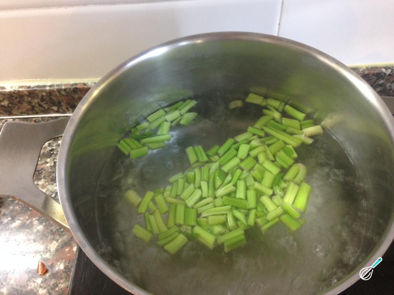 Para começar, lave e corte os troncos de aipo e deixe ferver durante alguns minutos. Escorra e deixe descansar sobre um pano limpo.