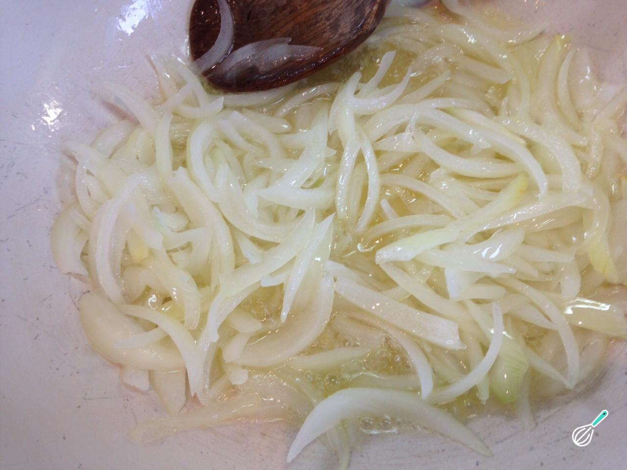 Corte a cebola em tirinhas julienne e refogue em uma panela com óleo.