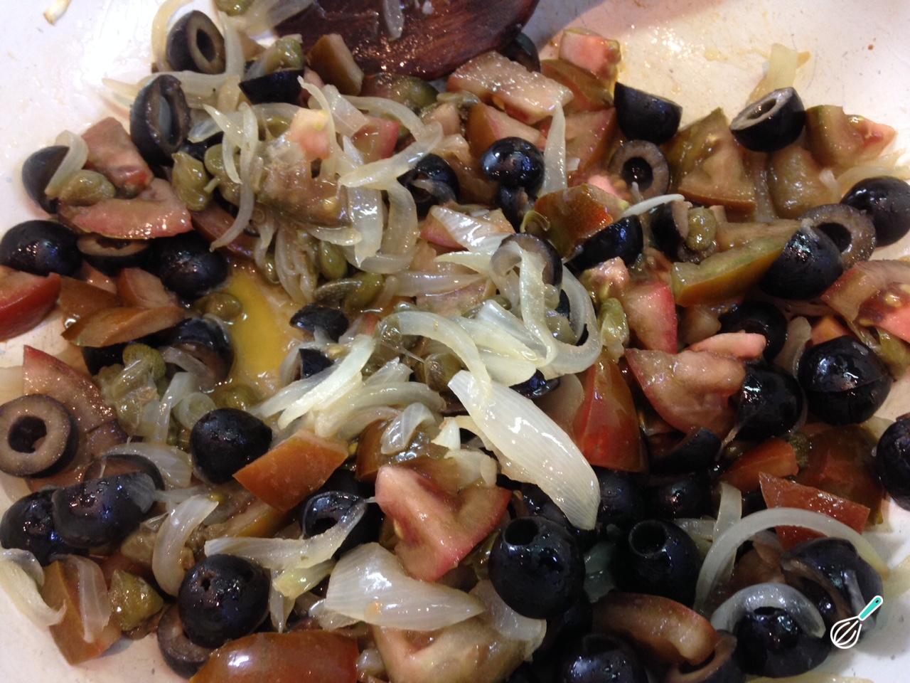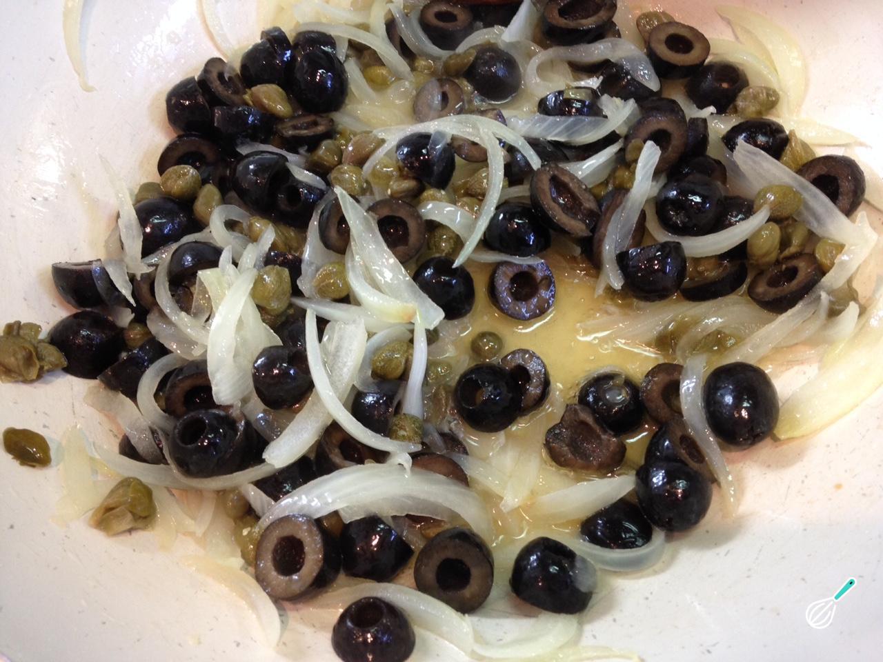 Quando a cebola ficar transparente, adicione as azeitonas cortadas em metades e as alcaparras. Se que usar pinhões, é o momento de adicioná-los.