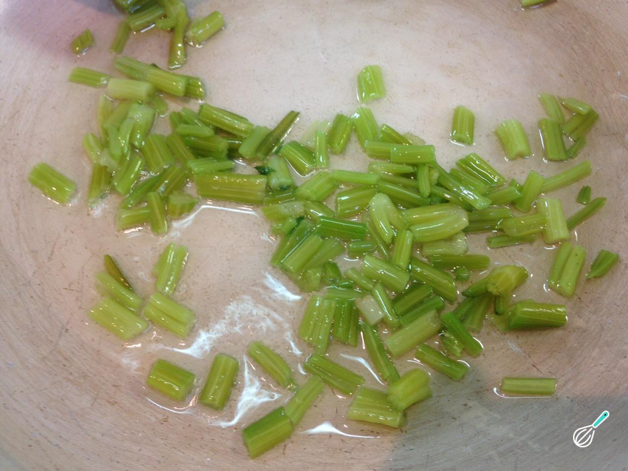 Em outra frigideira com óleo, refogue o aipo fervido anteriormente. Dois minutos serão suficientes. Transfira o aipo para a panela com a cebola e o tomate com a ajuda de uma escumadeira.