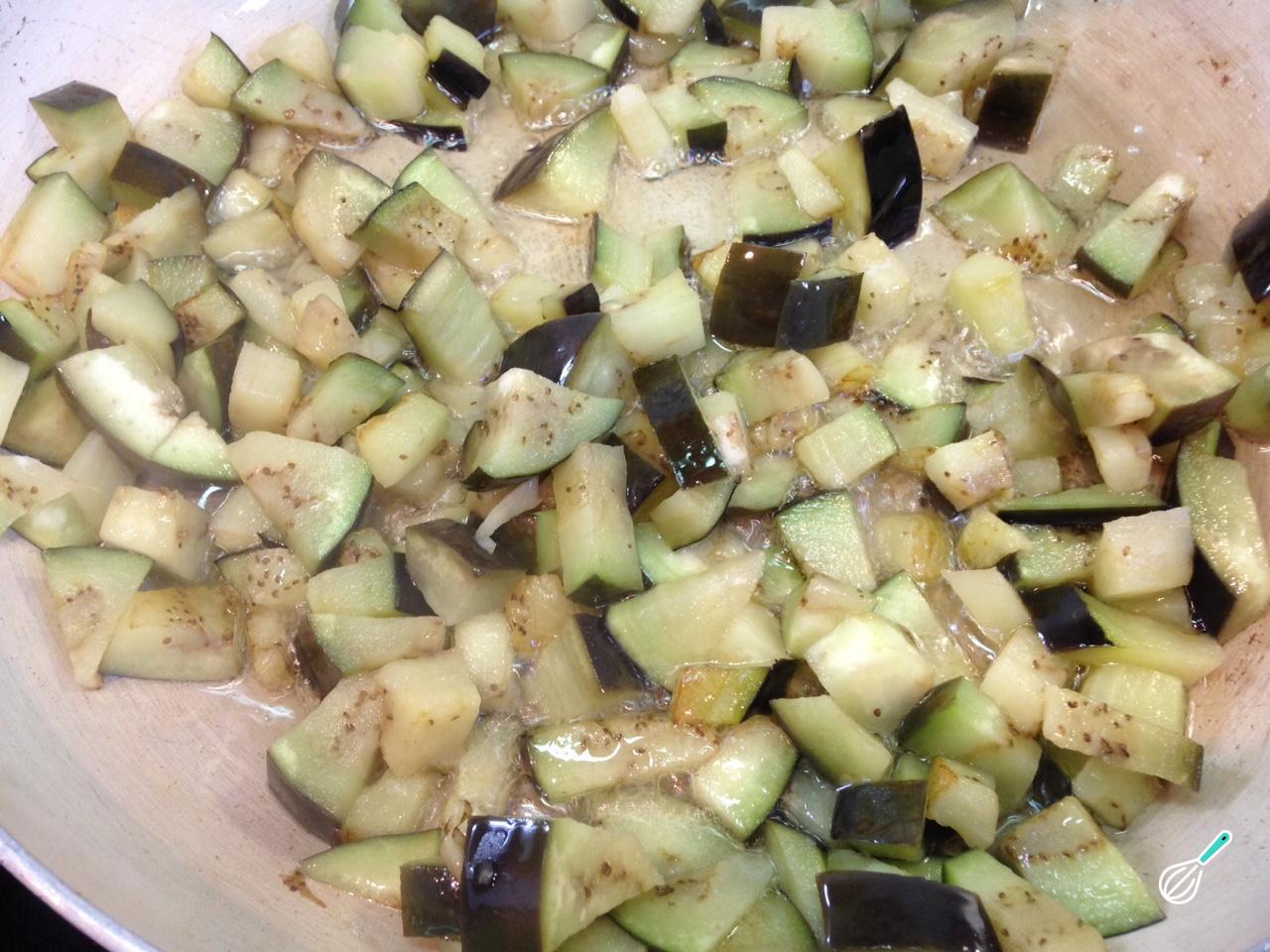 Na mesma panela onde refogou o aipo, adicione um pouco de óleo e, quando estiver bem quente, junte as berinjelas, previamente lavadas e picadas, primeiro no comprimento e depois no sentido transversal.