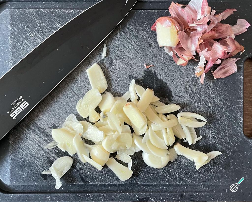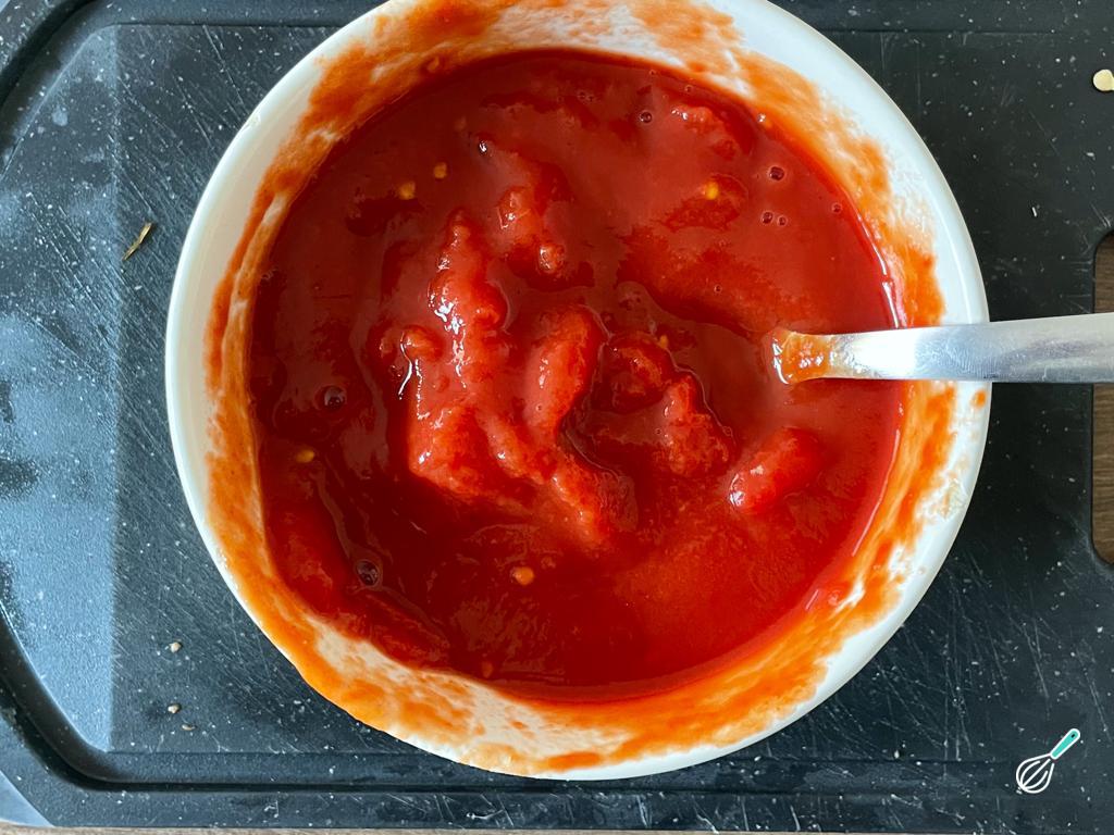 Esmague o tomate pelado para ficar em pequenos pedaços.