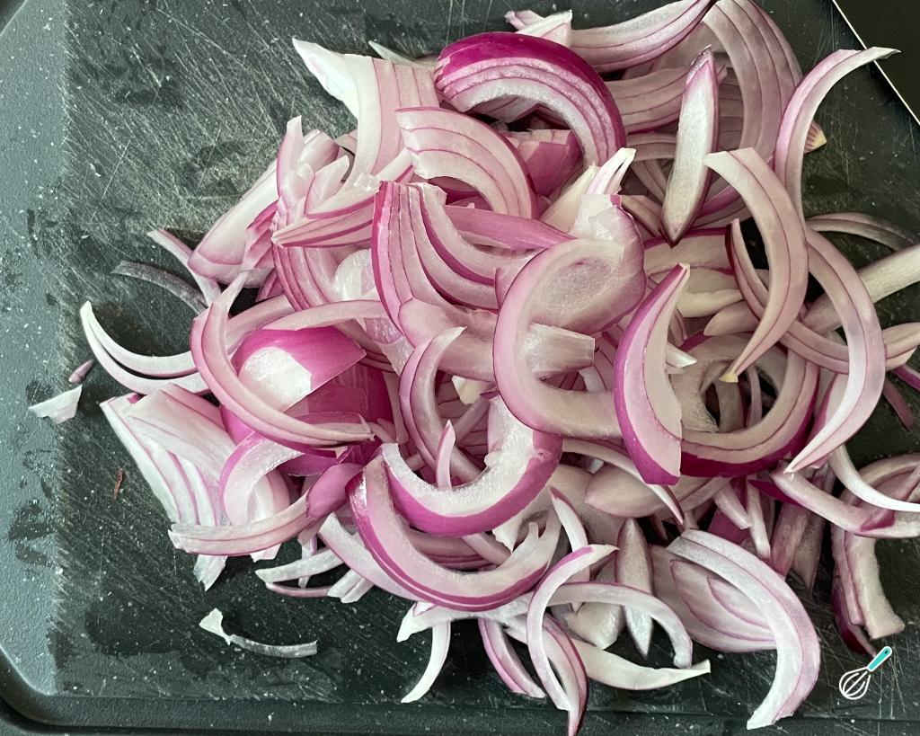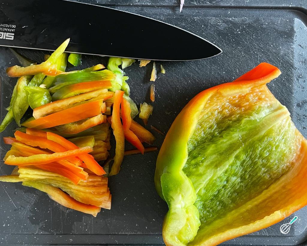 Corte o pimentão ao meio, retire a parte branca e as sementes, corte-o em tiras e corte as tiras ao meio.