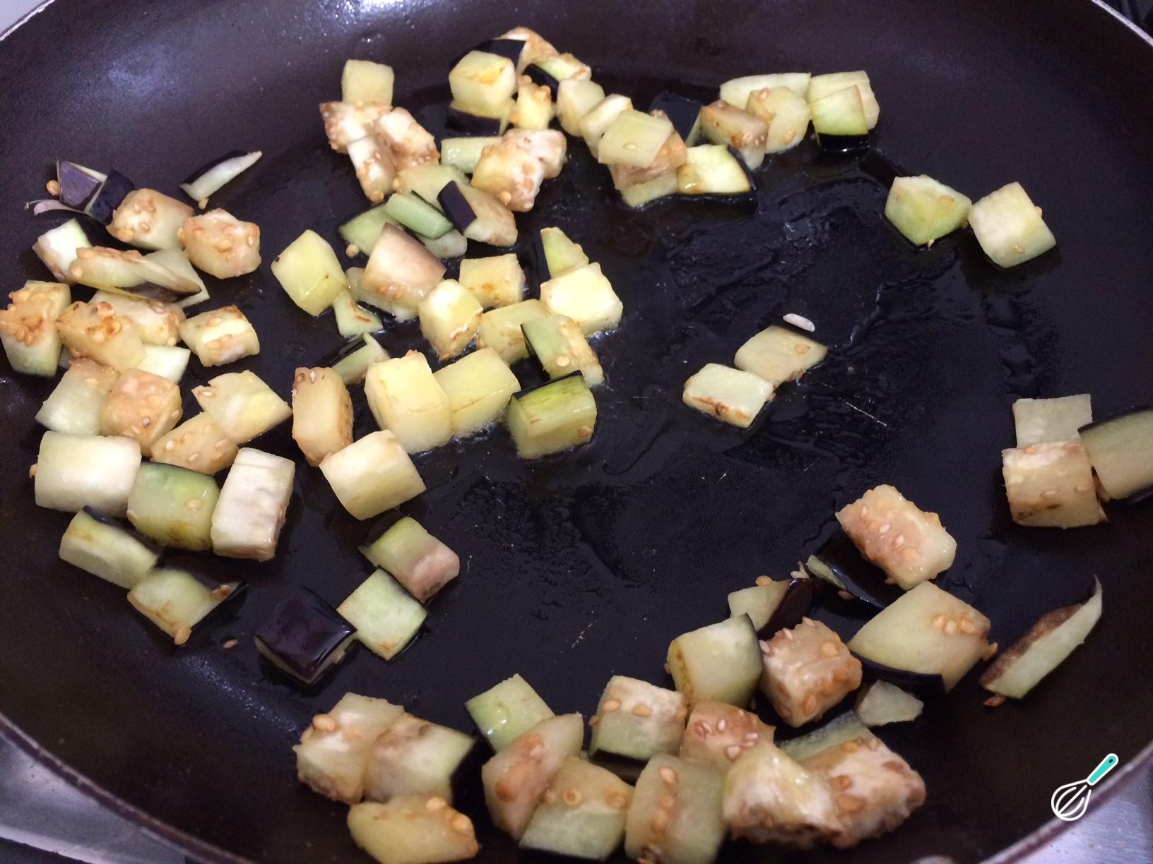 Em uma frigideira com azeite refogue a berinjela, cortada em cubos, em fogo alto até dourar.