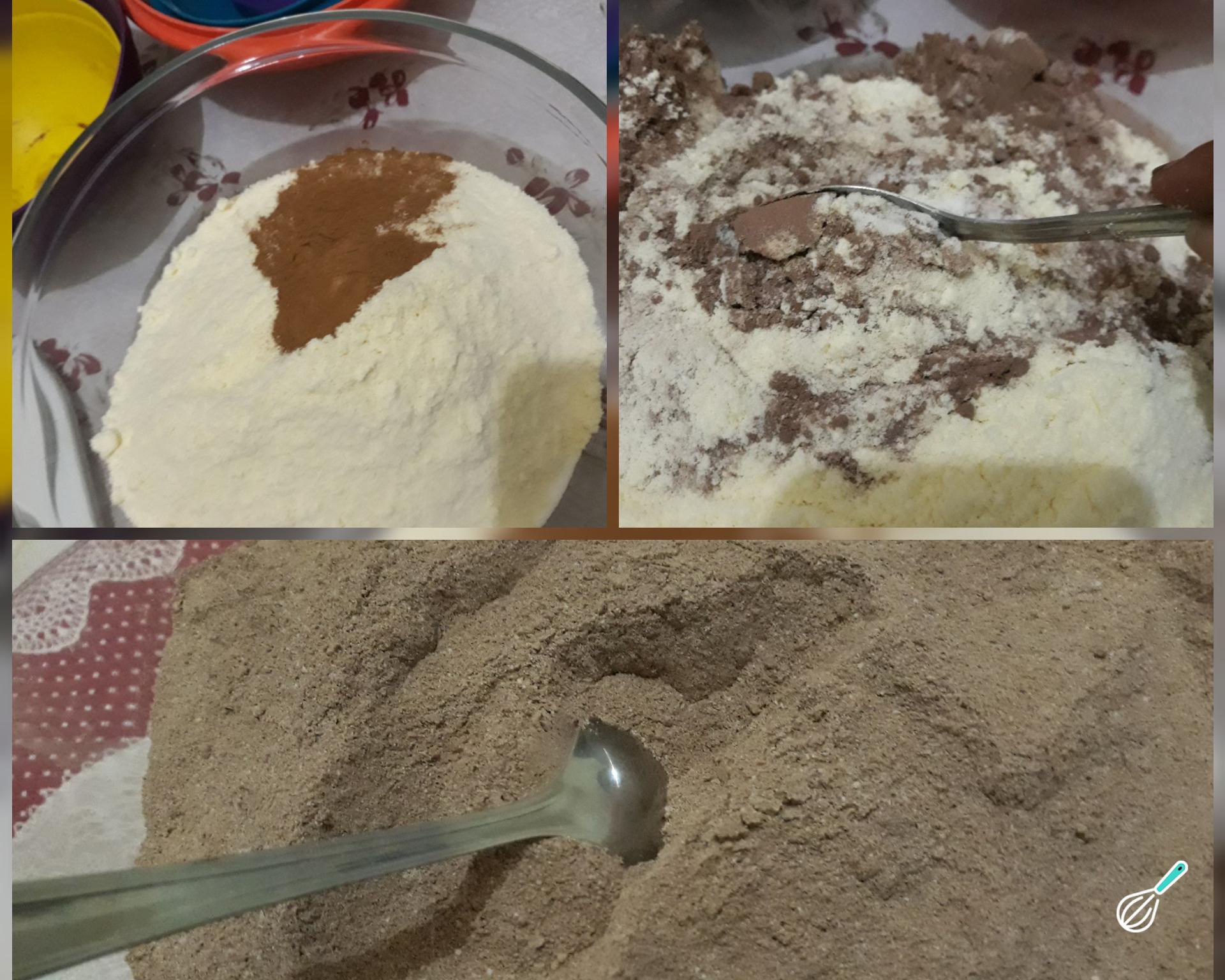 - Coloque a mistura em um bowl, adicione 150 gramas de leite em pó desnatado e mexa;