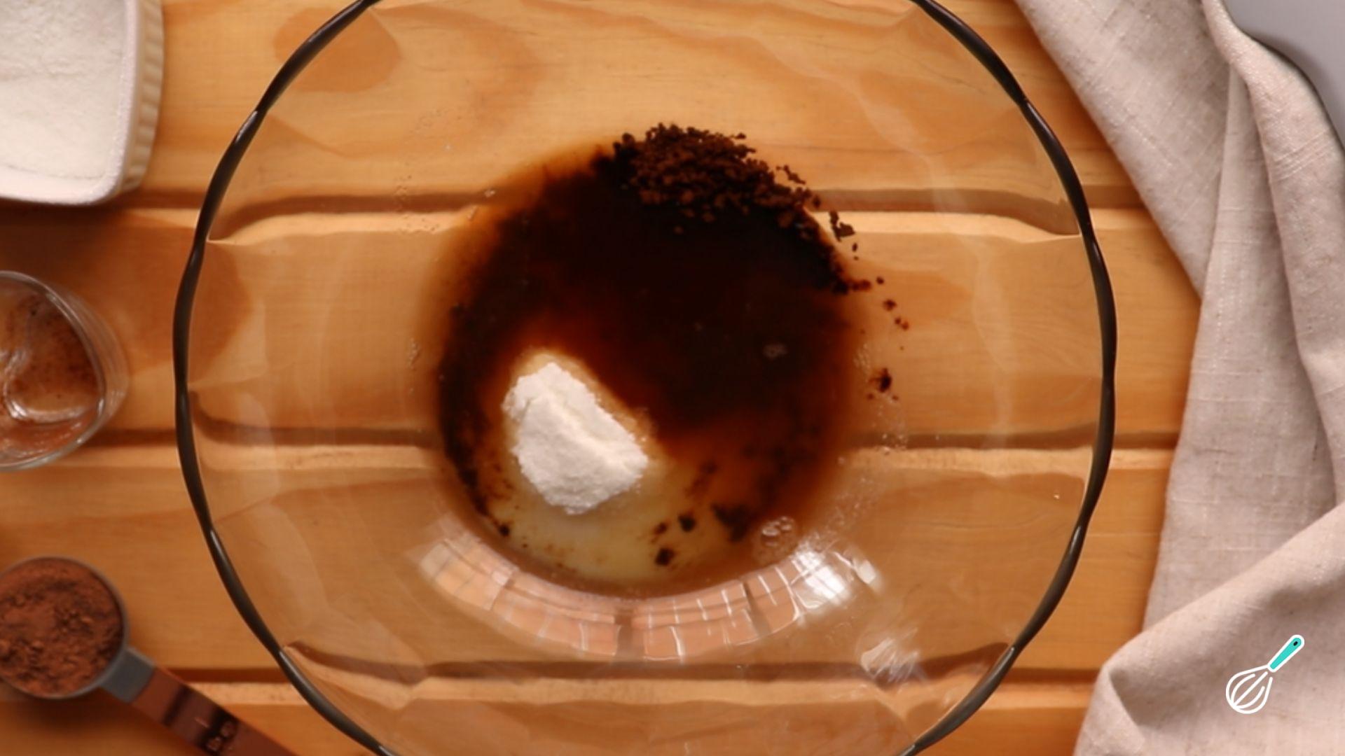 Então coloque na batedeira o açúcar, o café solúvel e a água e bata bem até ficar cremoso.