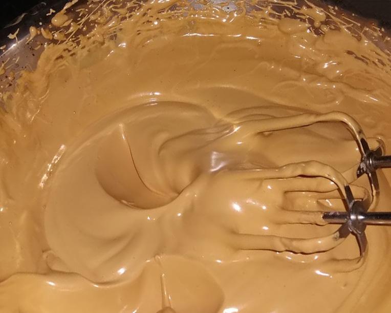 O capuccino está no pronto quando virar um creme bem suave, semelhante a merengue de café. Nesse momento adicione o chocolate ou cacau e bata mais um pouco, somente para misturar.