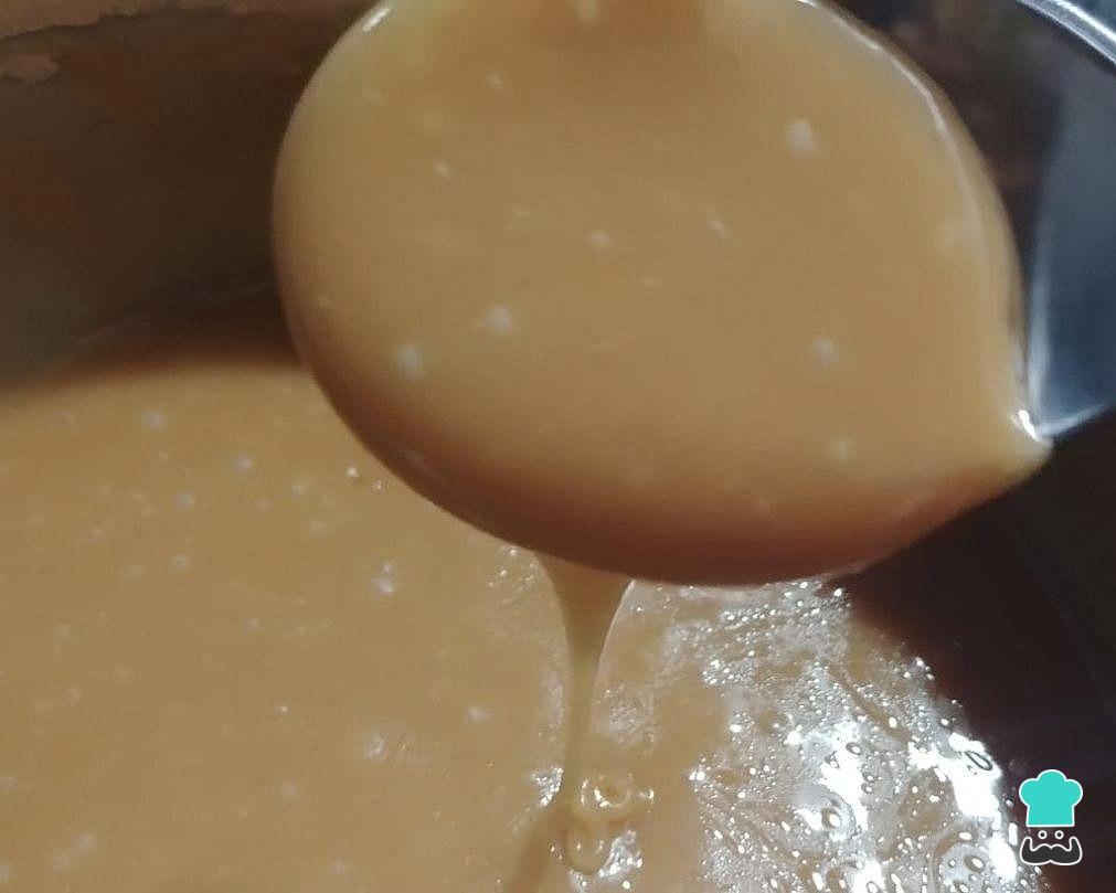 Quando os ingredientes do toffee vegano estiverem bem integrados, deixe cozinhar no fogo baixo por 40 minutos ou até engrossar e ficar dourado como na foto, sem esquecer de mexer de vez em quando para evitar queimar.