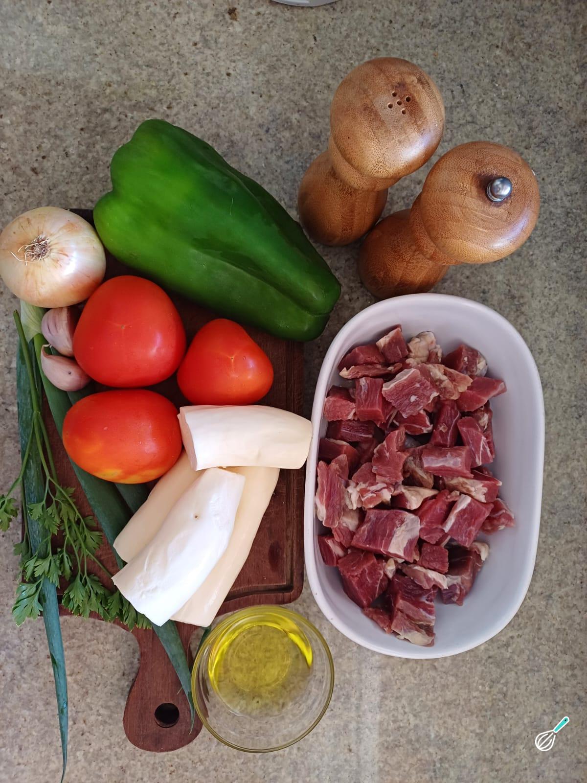 Reúna todos os ingredientes necessários para o preparo da receita de caribéu pantaneiro. Pique a cebola, o alho, o cheiro verde, os tomates e os pimentões em cubos. Descasque e corte a mandioca em cubos grandes e reserve.