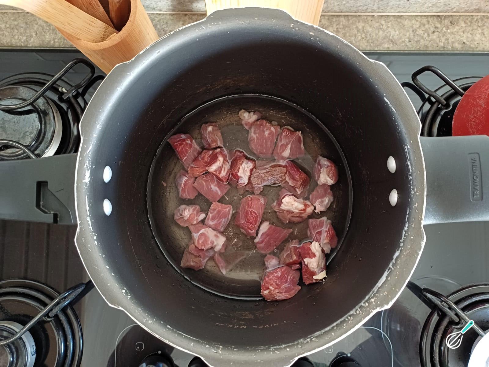 Dica: Para dessalgar a carne seca, coloque os pedaços de carne em uma panela com água suficiente para cobrir, leve ao fogo e deixe até começar levantar fervura. Em seguida descarte a água e reserve.