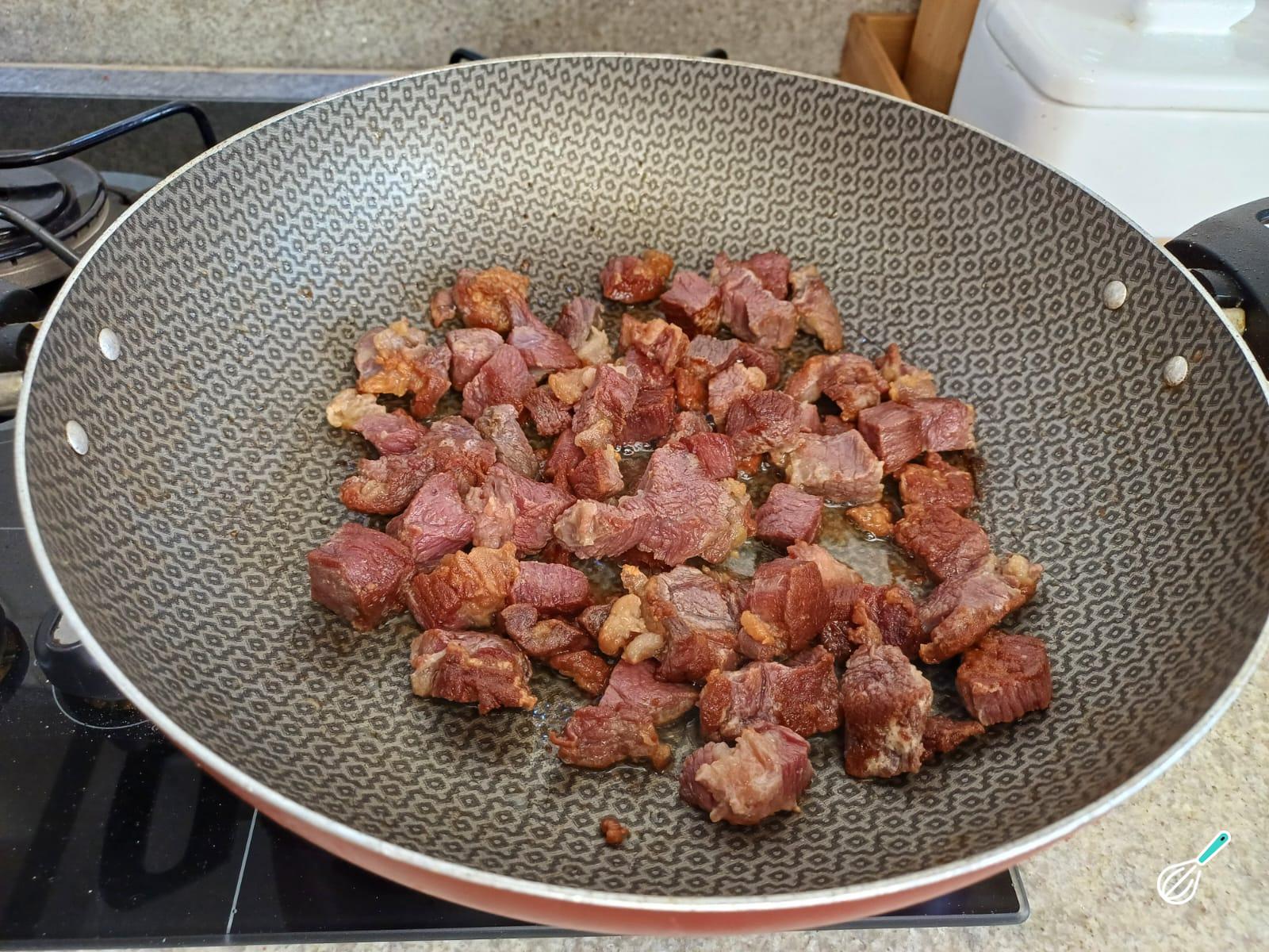 Em uma panela grande, coloque o azeite e frite bem a carne seca já dessalgada, em fogo médio por 10 minutos mexendo sempre.