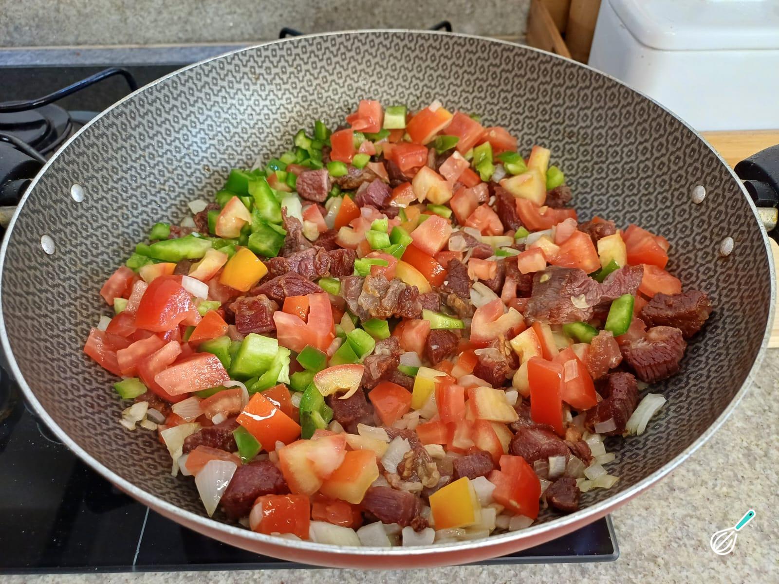 Acrescente a cebola, o alho e refogue bem. Logo após adicione os tomates, os pimentões, e deixe refogando mais um pouco.