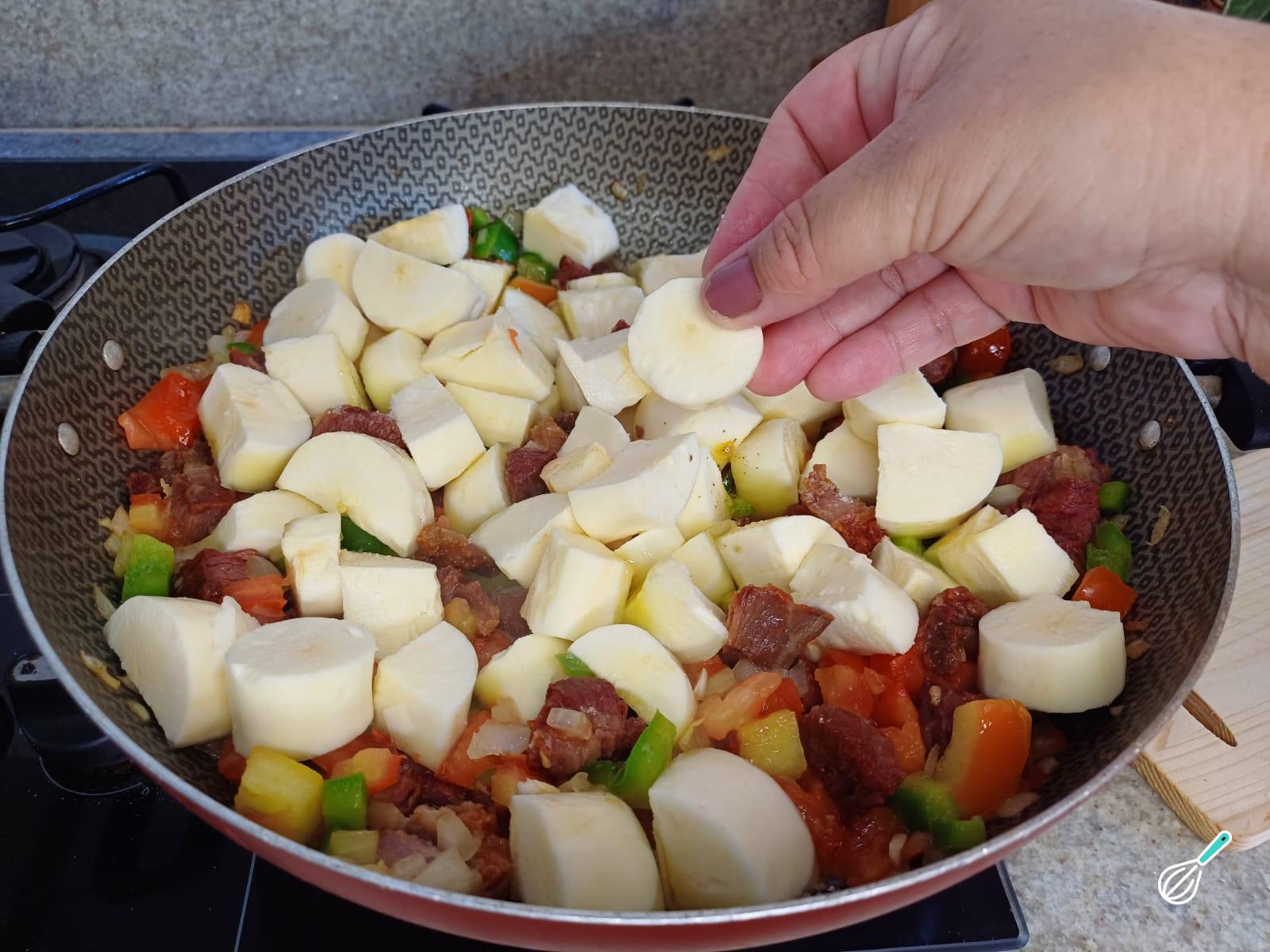 Coloque agora a mandioca e tempere com sal e pimenta do reino a gosto. Misture bem para agregar o sabor.