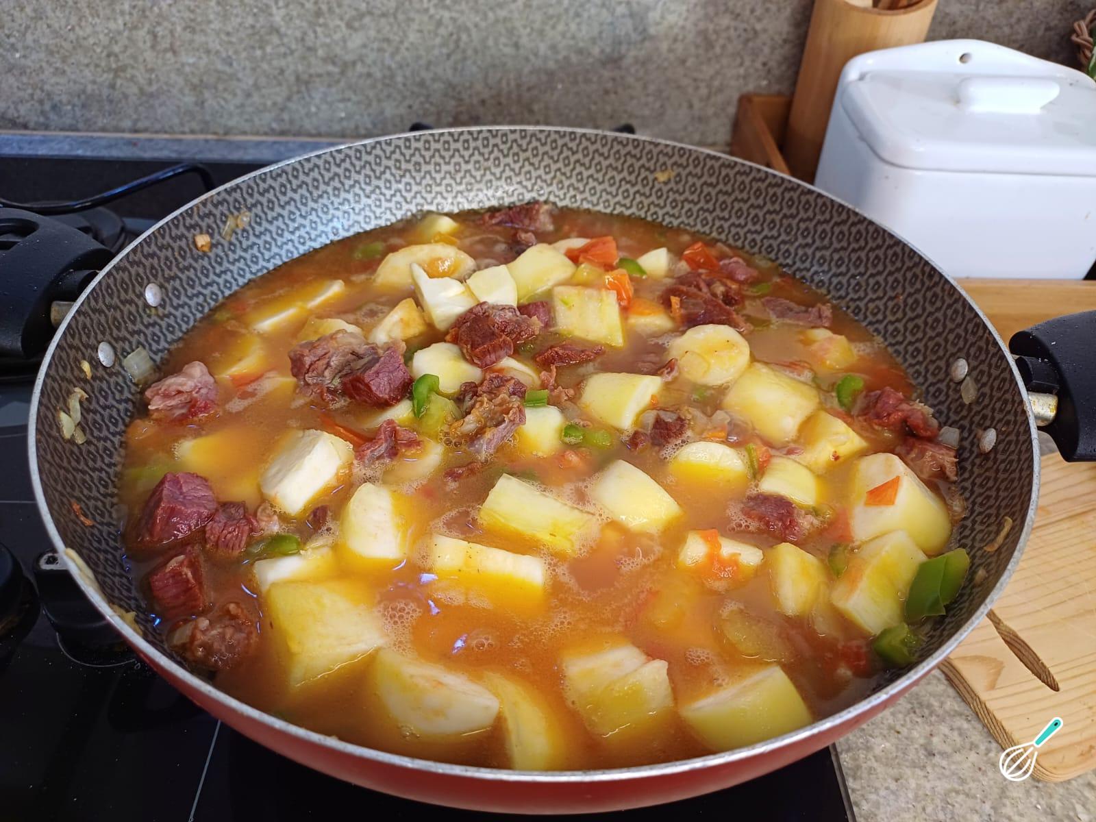 Cubra com a água fervente e misture bem. Deixe cozinhar por 30 minutos ou até que a mandioca e a carne seca fiquem macias. É bom mexer sempre para não grudar no fundo da panela. Pode acrescentar mais água se necessário.