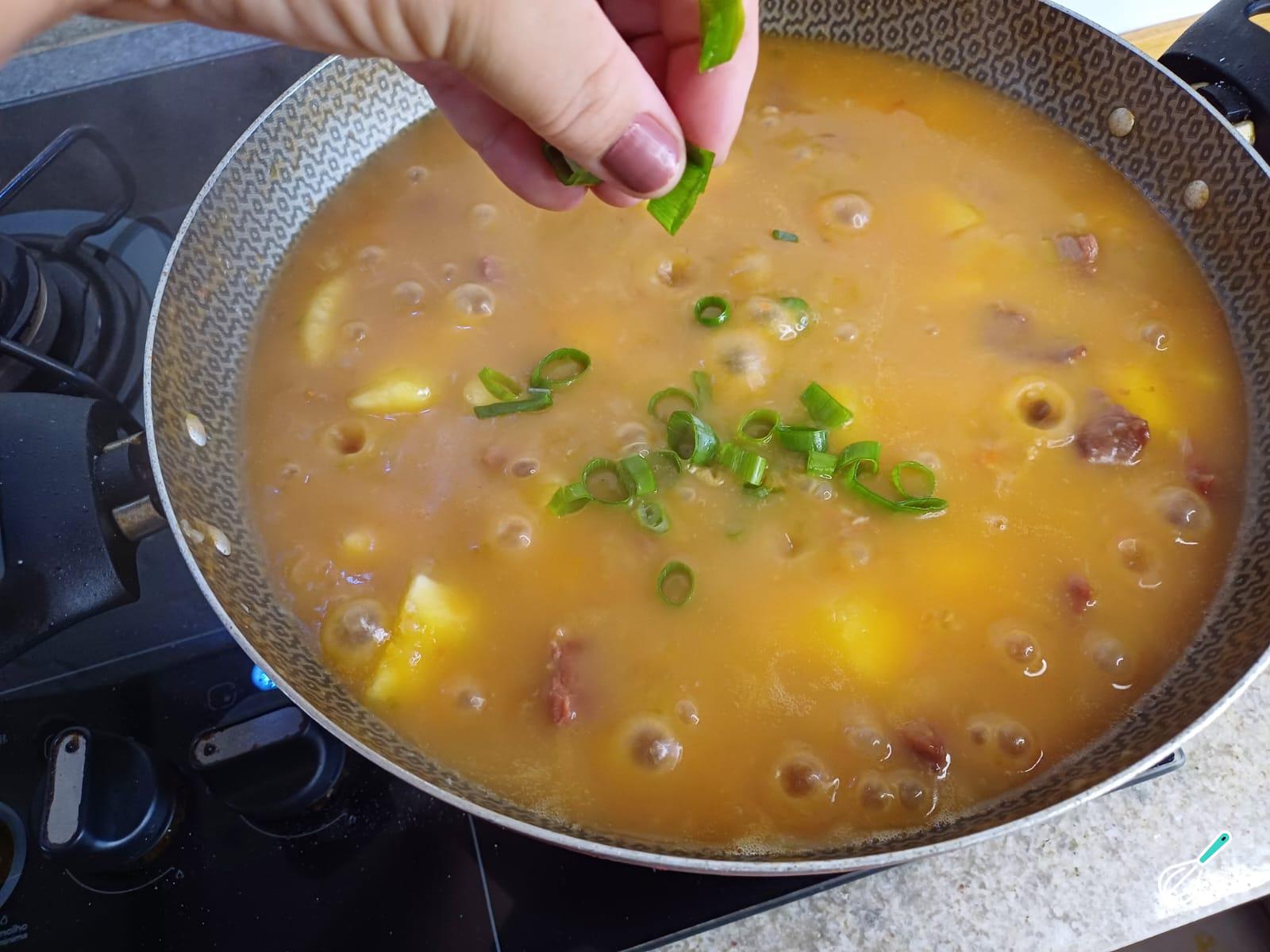 Desligue o fogo, verifique o sal e finalize com bastante cheiro verde picado, que traz mais sabor e aroma à receita. Misture bem.