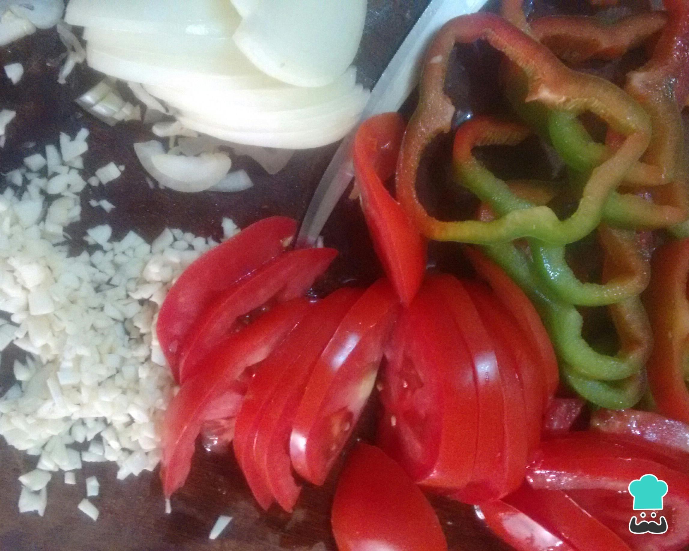 Enquanto isso prepare os temperos desta receita de carne com linguiça calabresa na panela de pressão: pique o alho, corte a cebola, o pimentão e os tomates.