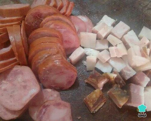 Em uma panela de pressão distribua todos os ingredientes, exceto a calabresa, o bacon e o cheiro verde. Acrescente um litro e meio de água filtrada, tampe a panela e leve ao fogo por 45 minutos. Enquanto isso frite a calabresa e o bacon e reserve.