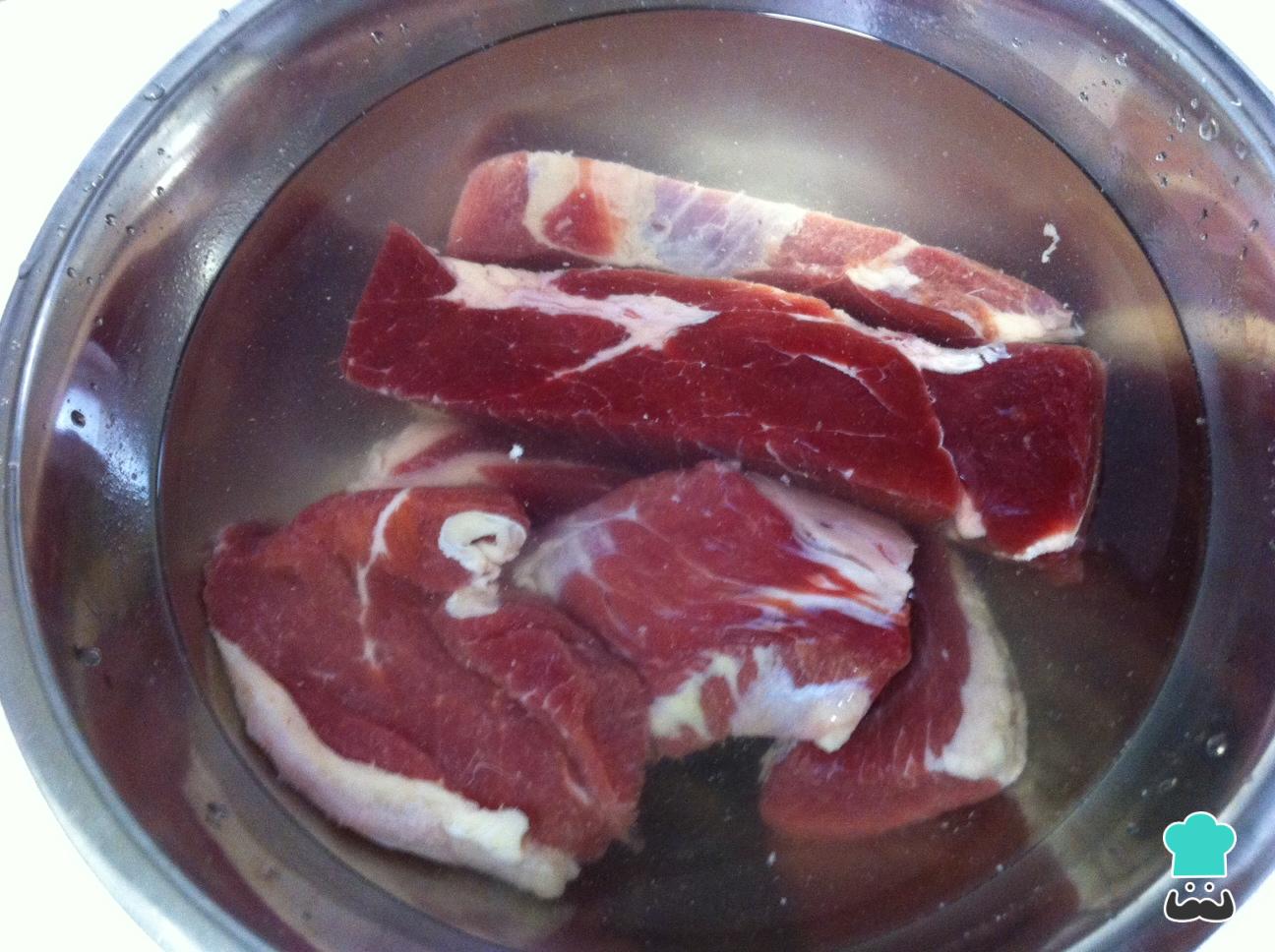 Para preparar carne de charque o primeiro passo é cortar a carne em pedaços médios (caso esteja inteira) e lavar em água corrente.