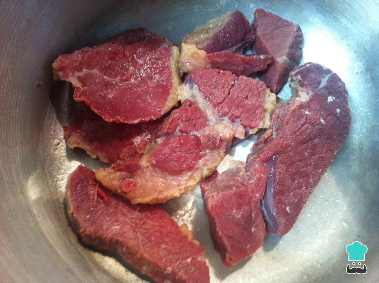 Após esse passo, é hora de cozinhar a carne de charque! Coloque-a na panela de pressão, cubra com água limpa e cozinhe por 30 minutos.