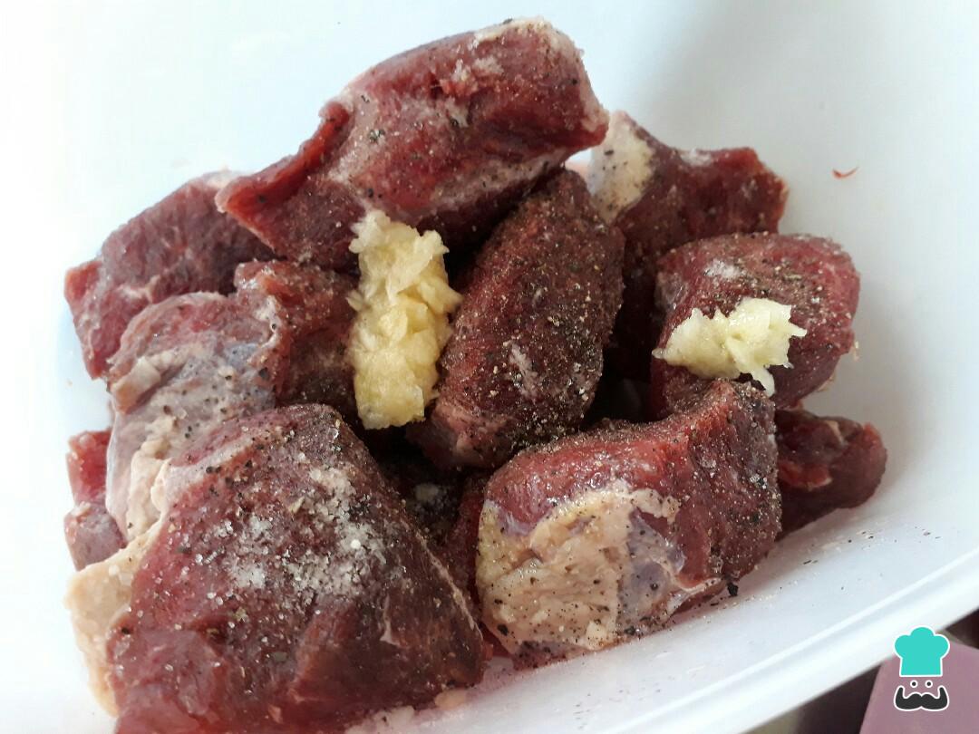 Prepare esta carne de panela ao molho de urucum começando por temperar a carne com alho, sal e a pimenta do reino.