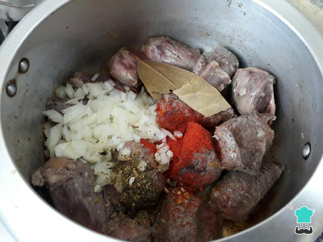 Em uma panela de pressão coloque o óleo e espere ficar bem quente para selar a carne, assim ela não perderá seu suco e maciez. Para selar coloque a carne e deixe dourar por 3 minutos, vire e deixe fritar pelo mesmo tempo novamente. Nesse momento adicione o urucum, o louro, o chimichurri e a cebola.