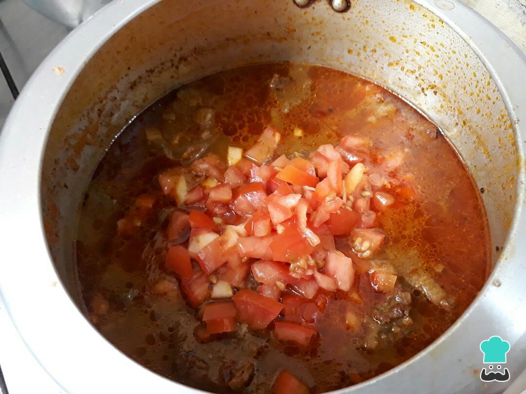 Após o tempo indicado, retire a pressão e adicione o tomate picado. Misture bem e deixe mais 4 minutos na pressão, para o tomate desmanchar e engrossar o molho da carne.