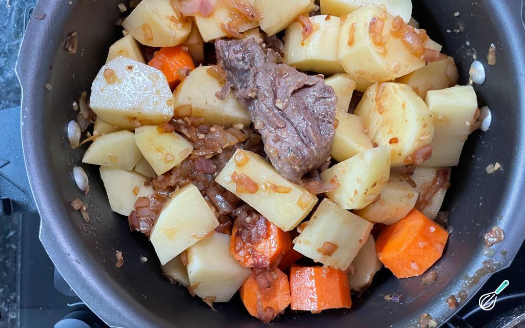Na panela de pressão, adicione junto ao refogado, a carne, as batatas e a cenoura. Tempere com o sal, a páprica picante, a cúrcuma em pó, coloque a água e leve para pressão por 30 minutos após a panela pegar pressão.